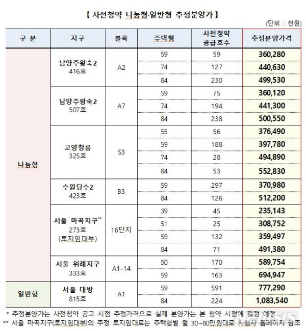 나눔형: 서울 위례지구 60㎡ 이하는 5억~6억원대, 이외 지구는 전용면적 기준 60㎡ 이하는 3억원대, 74~84㎡는 4억~5억원대
